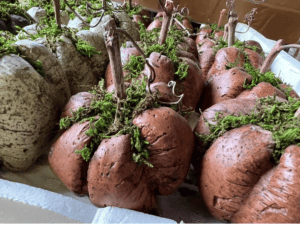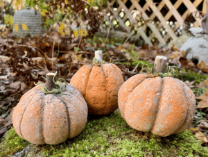 We’ll create 2-4 pumpkins with a lightweight concrete mix that can handle the elements of the outdoors and last many years. The number of pumpkins you create will depend on the size you make them.